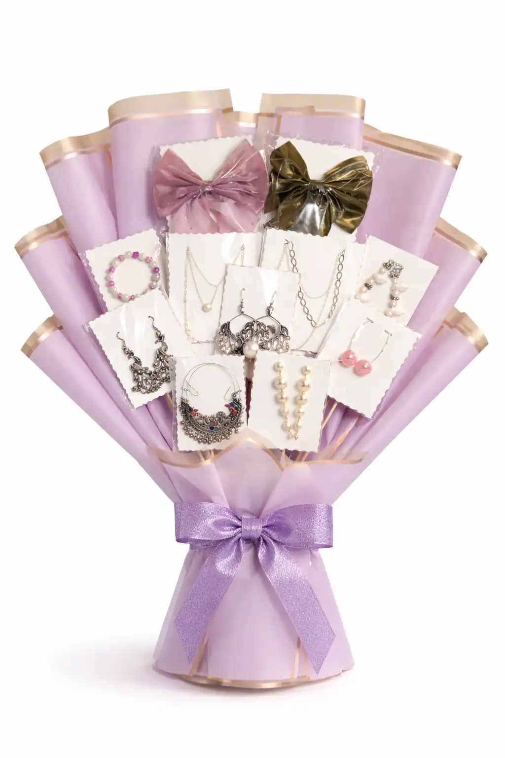 A soft lavender bouquet adorned with elegant jewelry pieces and delicate bows, perfect for gifting grace, charm, and a touch of dreamy sophistication.
