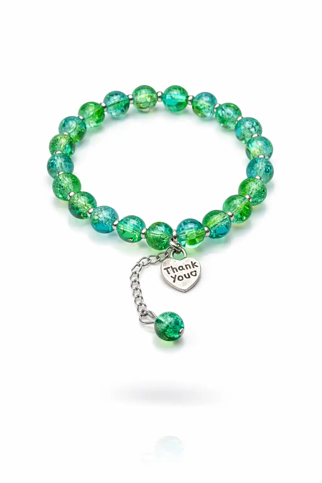 A vibrant mix of green crystal beads with a cute “Thank You” heart charm—perfect for adding a fresh, elegant touch to any outfit.