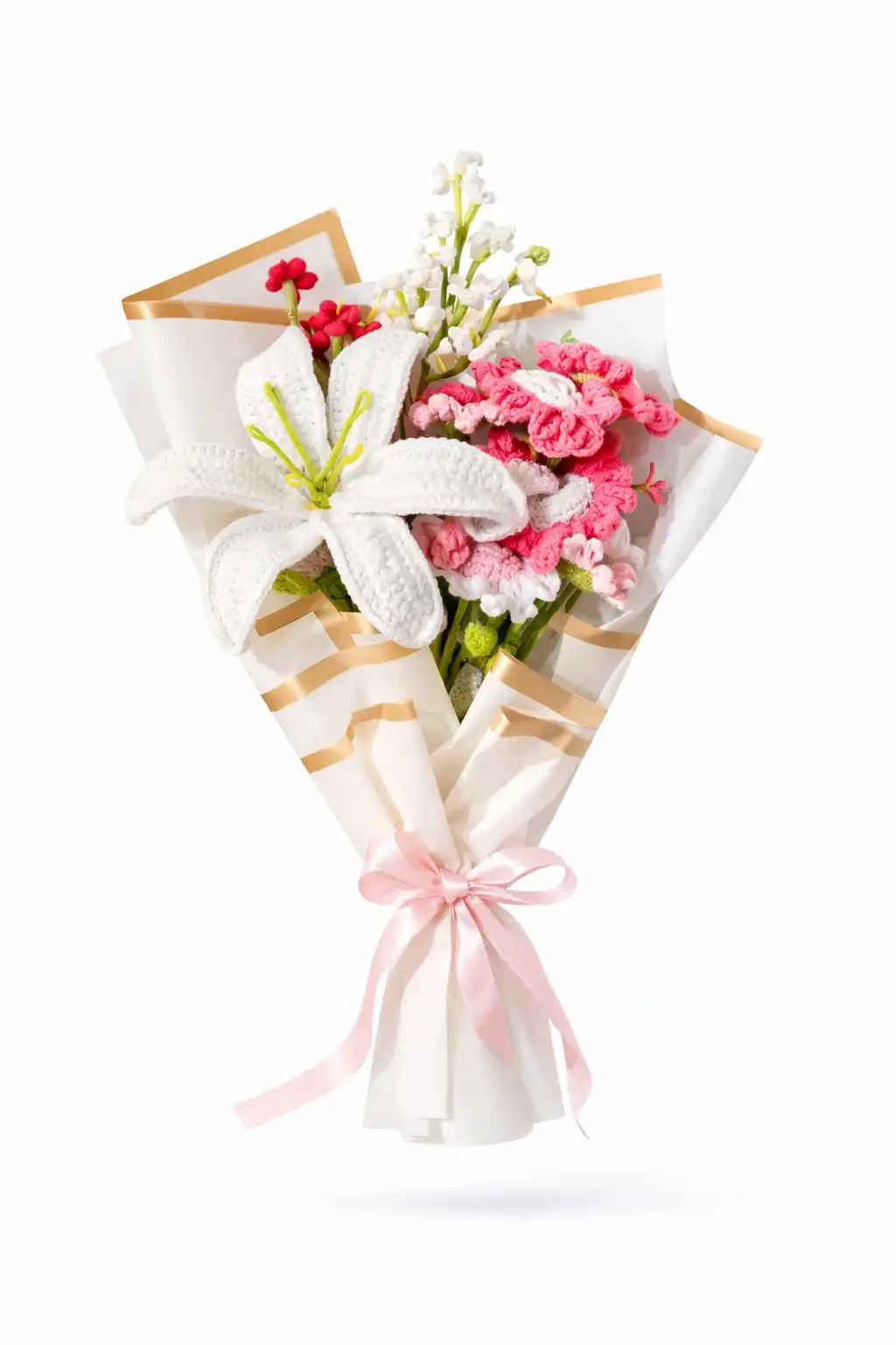 An elegant bouquet of ivory lilies and blush florals, styled with soft textures and finished with gold-edged wrapping for a luxurious, timeless look.