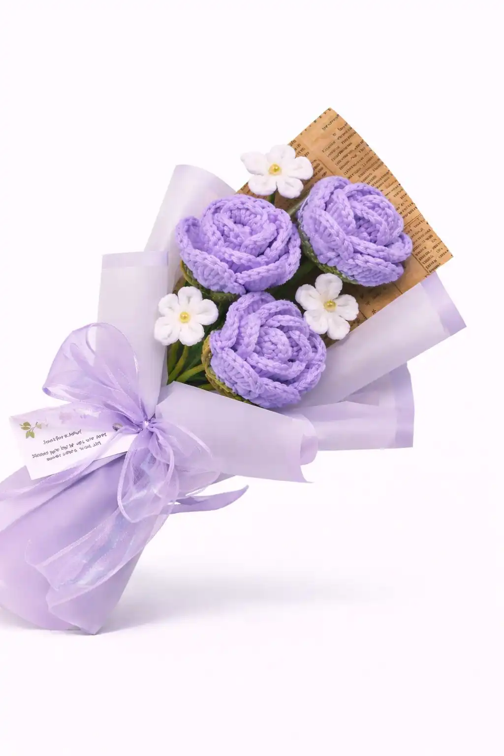- 3 crochet lavender roses, mini white flowers, premium wrap, ribbon bow, message card