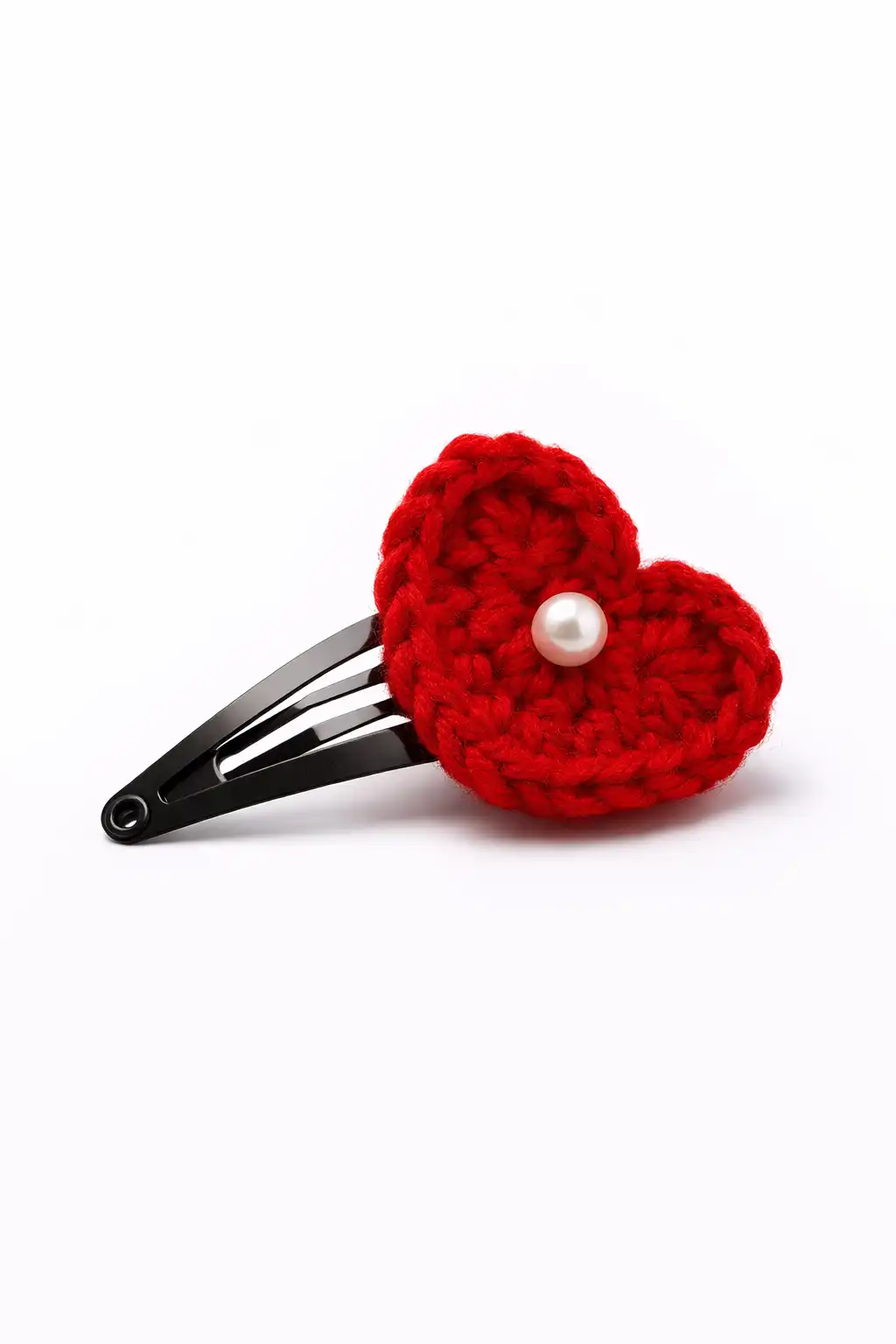 A handcrafted red crochet heart hair clip with a pearl center—cute, charming, and perfect for adding a touch of love to any look.