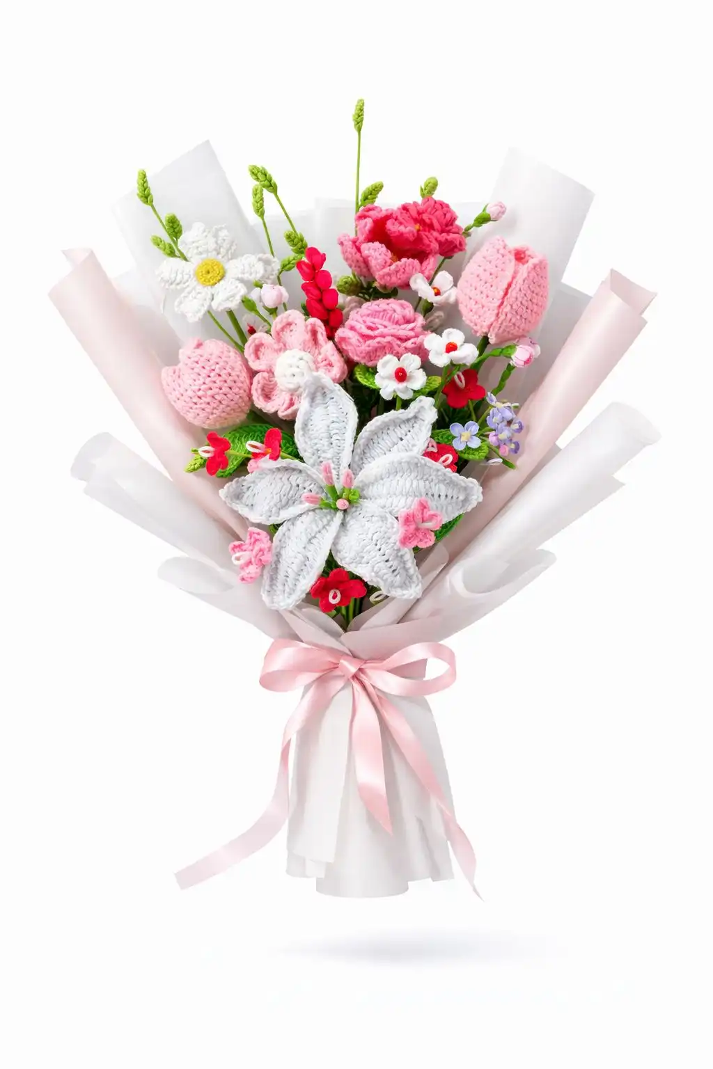 A soft, romantic crochet bouquet featuring delicate pink tulips, blooming roses, tiny white daisies, and a statement white lily at the center. Wrapped in pastel layers with a satin ribbon, it feels like a dreamy spring garden.