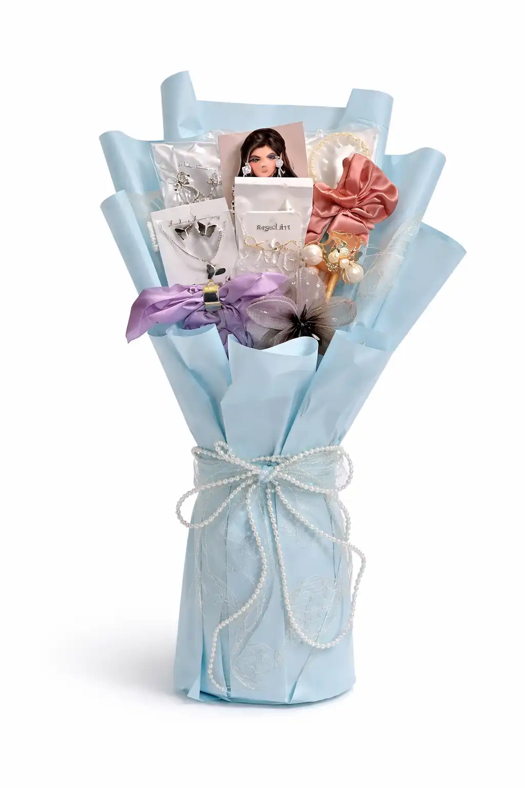 A dreamy sky-blue bouquet filled with elegant jewelry, soft bows, and delicate accents—perfect for gifting a touch of glamour, grace, and charm.