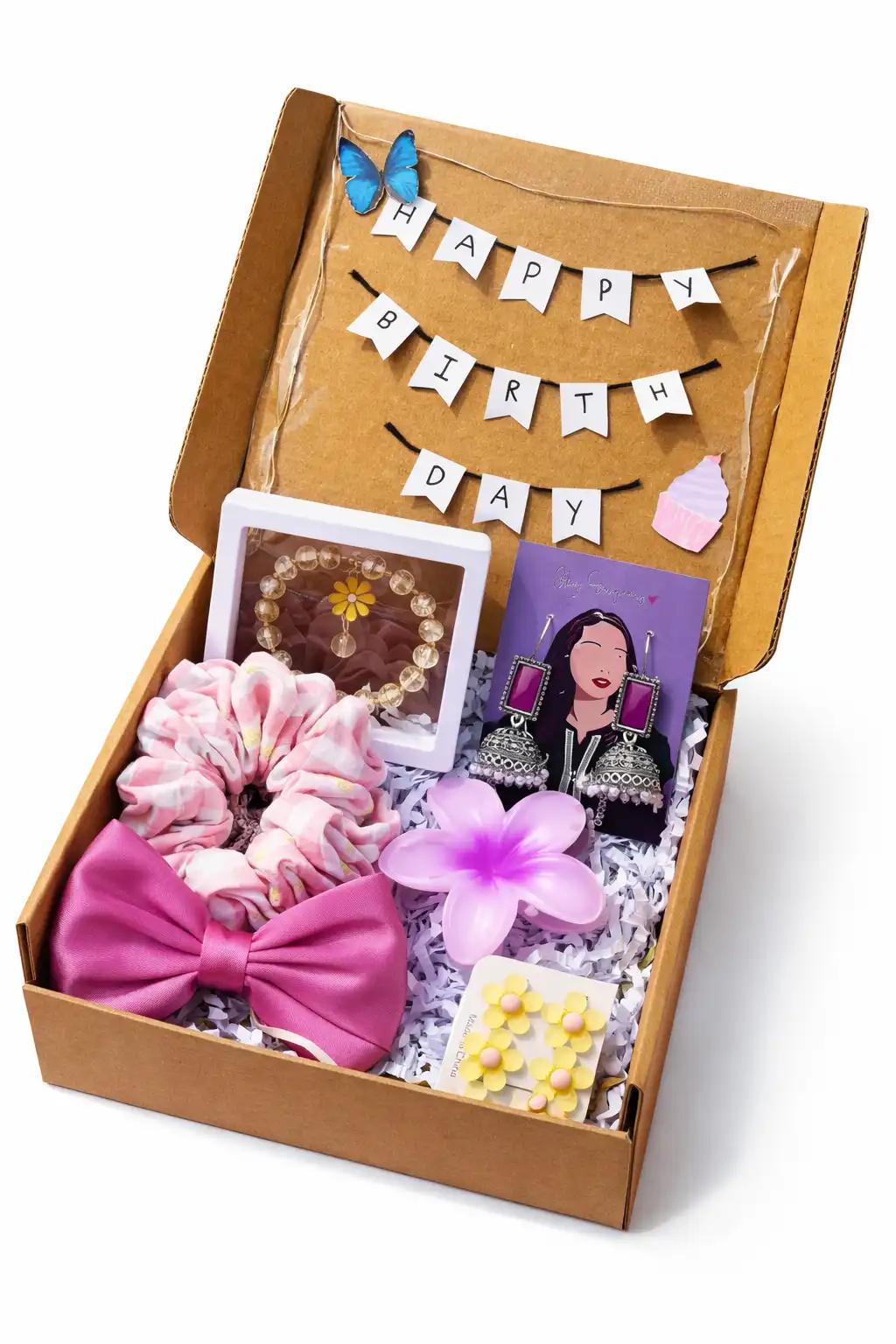 A cute surprise gift box filled with accessories, scrunchies, and sweet little details, designed to make birthdays extra special and full of joy.