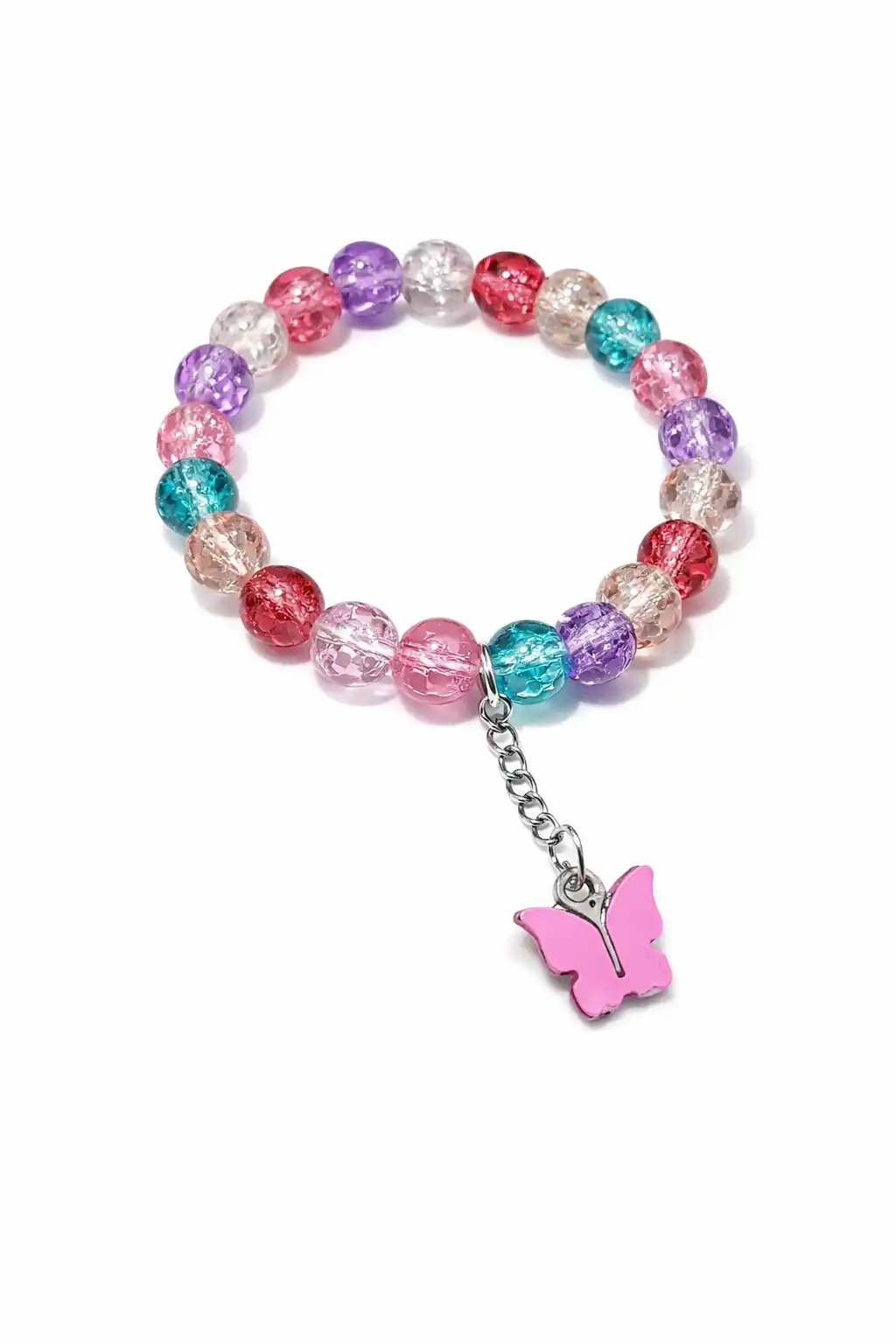 A vibrant pastel bead bracelet with a cute pink butterfly charm, adding a cheerful, playful touch to your everyday style.