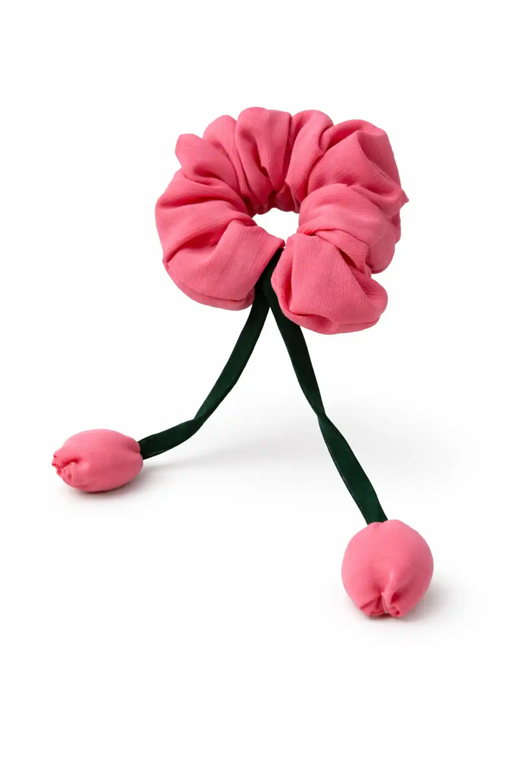 Playful pink scrunchie with ribbon ties for a cute, stylish look perfect for everyday wear.