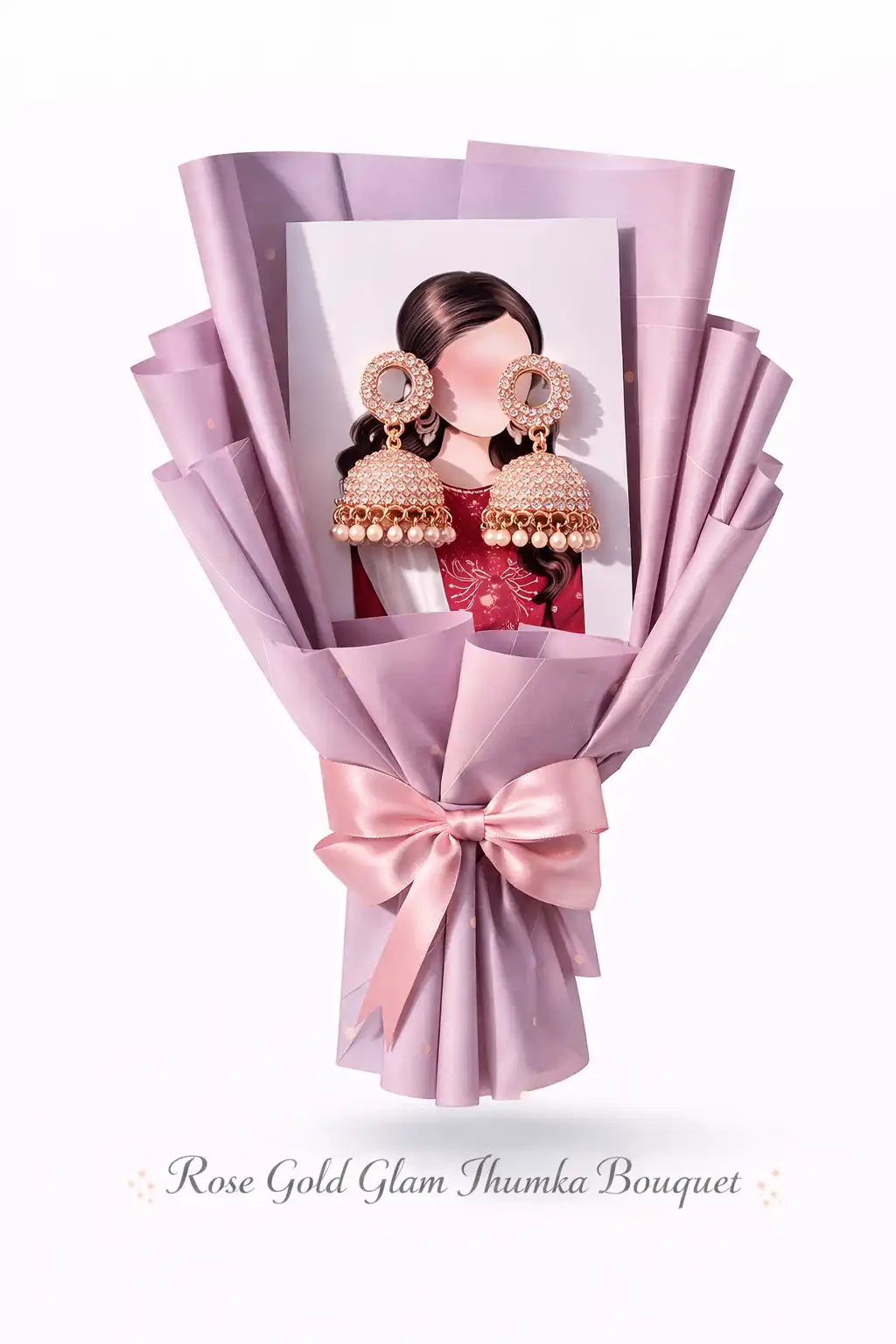 A stunning lavender bouquet showcasing statement earrings paired with a chic portrait card, wrapped in luxurious paper and finished with a satin bow—perfect for gifting timeless elegance with a personalized touch