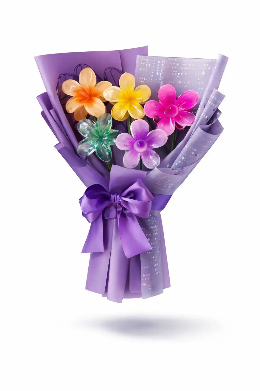 A playful and vibrant bouquet featuring glossy, colorful blooms wrapped in soft purple paper and tied with a satin bow—perfect for cheerful gifting and adding a pop of joy to any occasion.