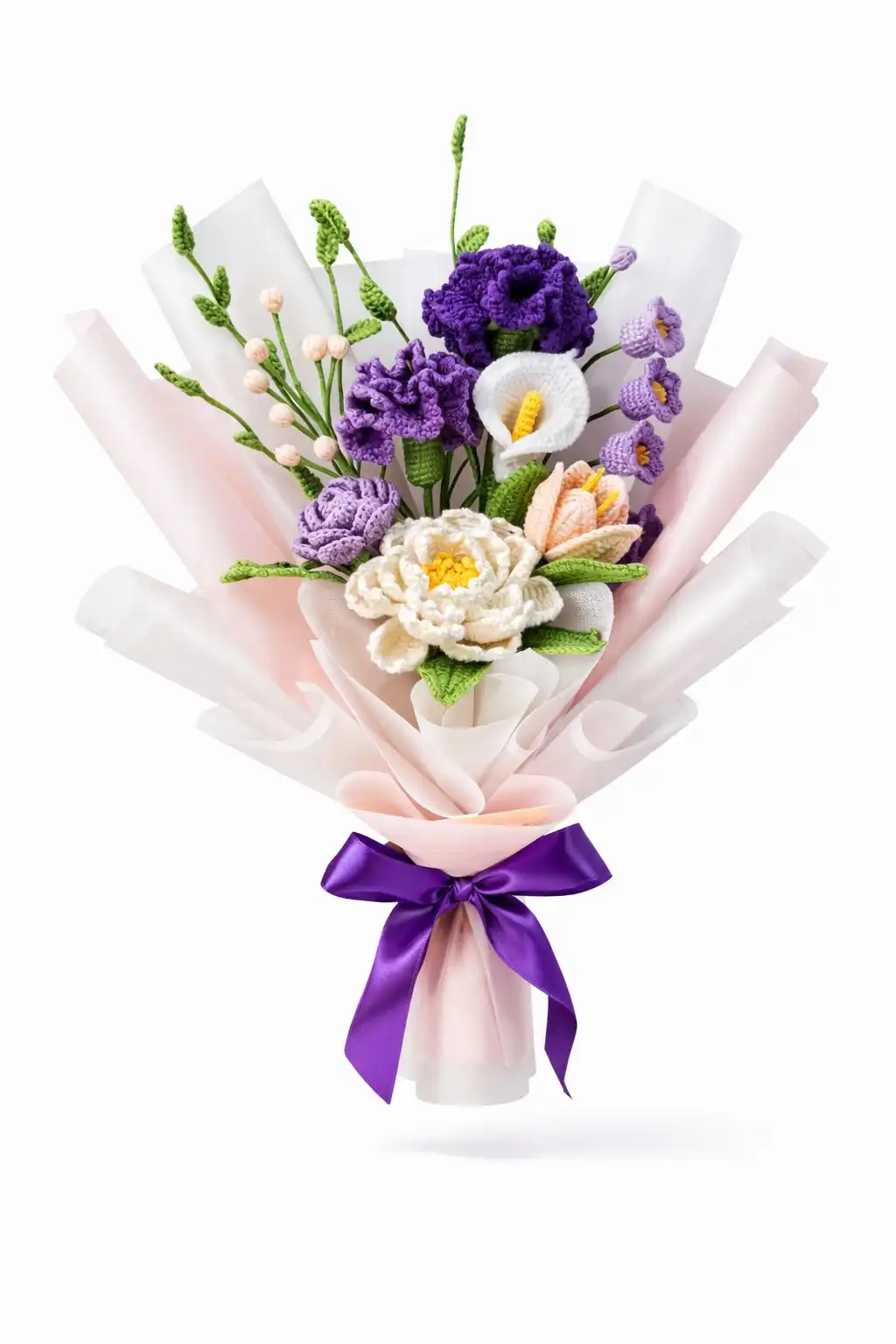 - • Premium Pastel Wrap + Purple Satin Ribbon