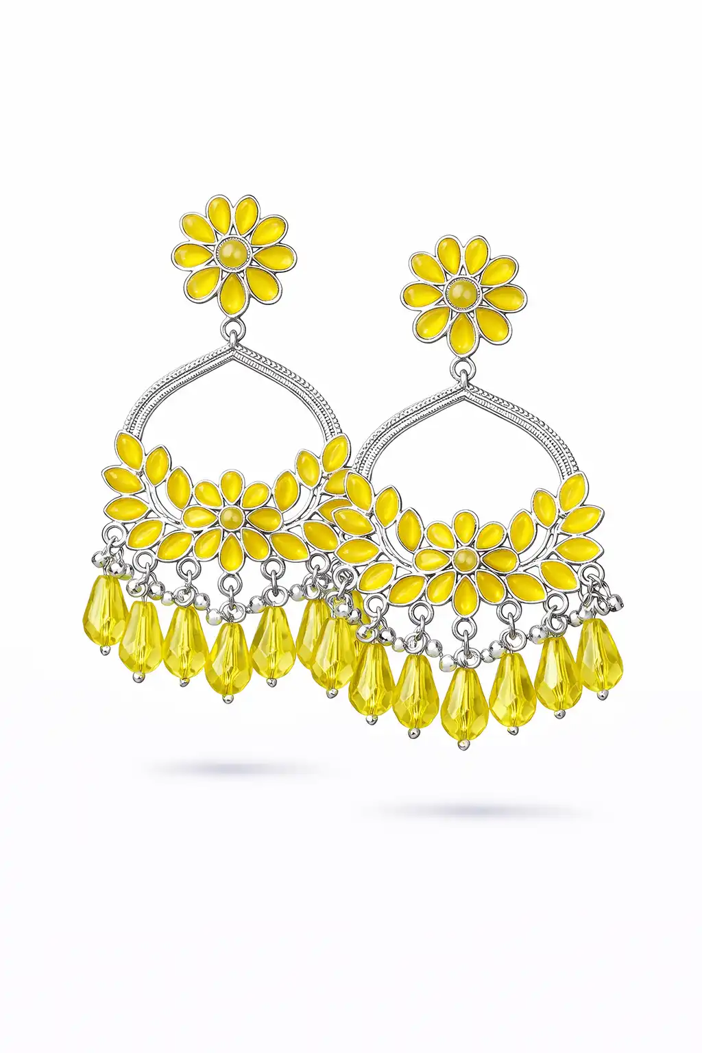 Bright yellow floral chandelier earrings with delicate bead drops, adding a cheerful, vibrant touch to your festive and casual looks.