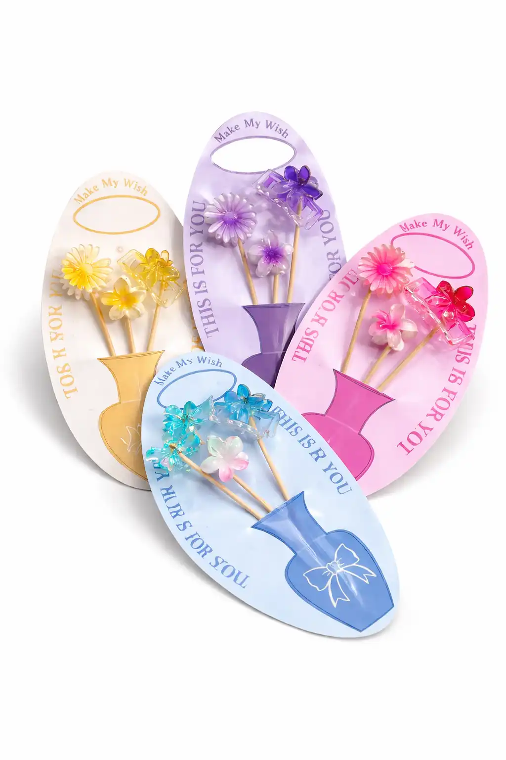 A cute 4 pcs collection of colorful mini flower charms on sticks, beautifully packed to express sweet wishes—perfect for gifting love, joy, and little magical moments.