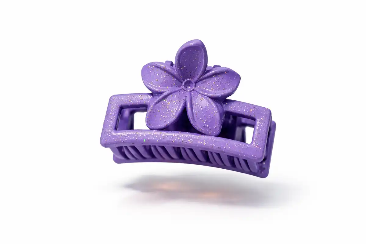 A pretty lavender floral claw clip with subtle glitter accents, adding a soft, playful sparkle to your everyday style.