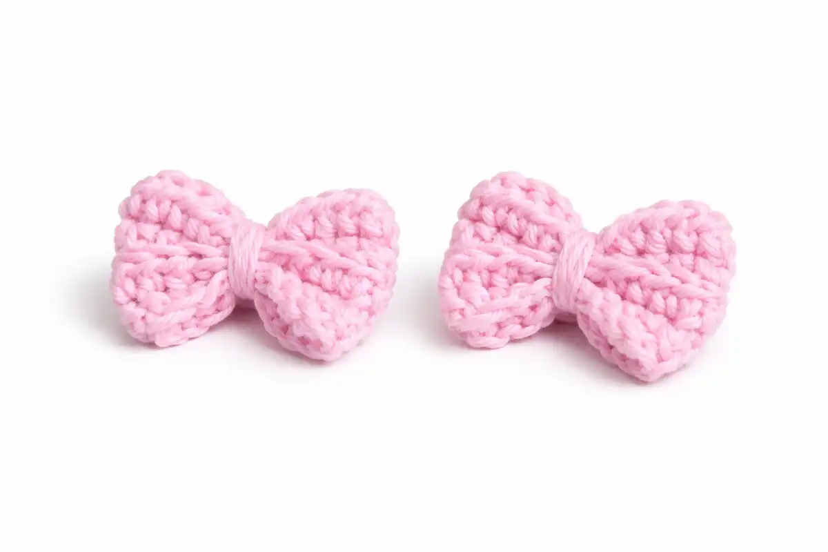 A pair of soft crochet pink bow clips, perfect for adding a cute, cozy, and playful touch to your everyday hairstyle.