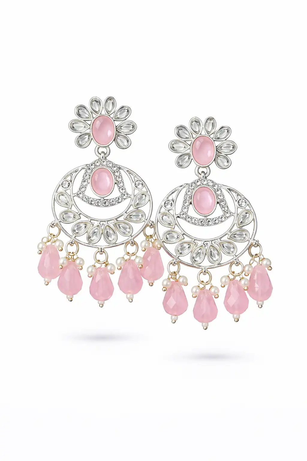 Intricate chandelier earrings with soft pink stones, sparkling crystals, and delicate pearl accents—perfect for a graceful and festive statement look.