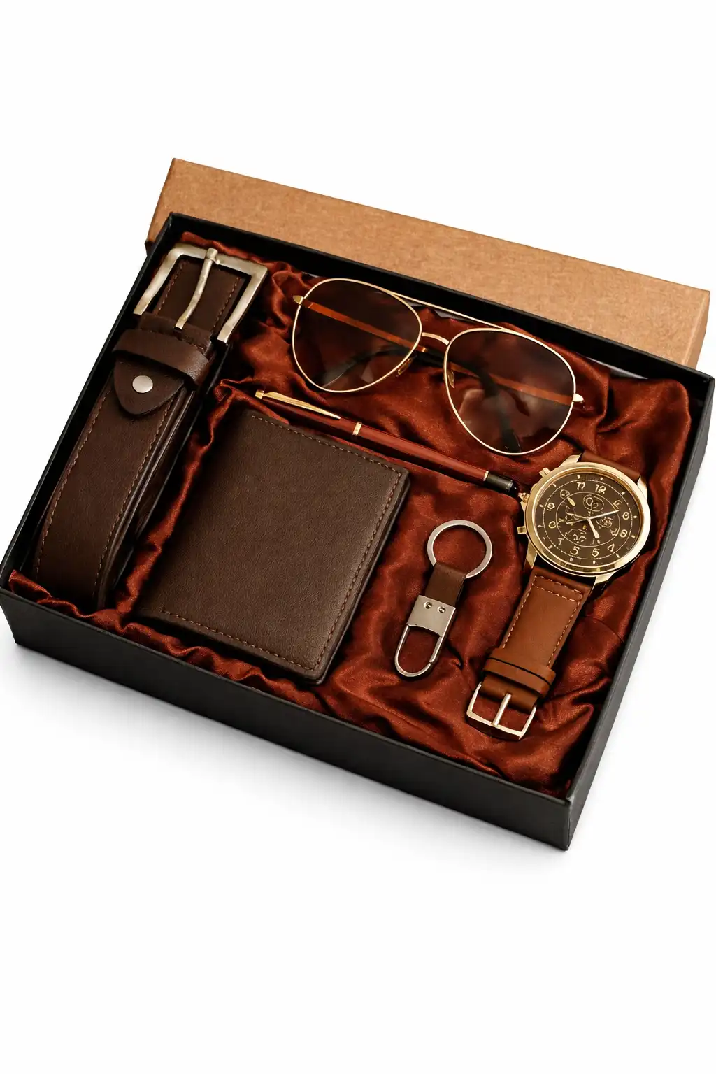 A timeless leather collection with wallet, belt, watch & sunglasses — perfect for everyday luxury. What’s Inside: Leather wallet Belt Watch Sunglasses Keychain