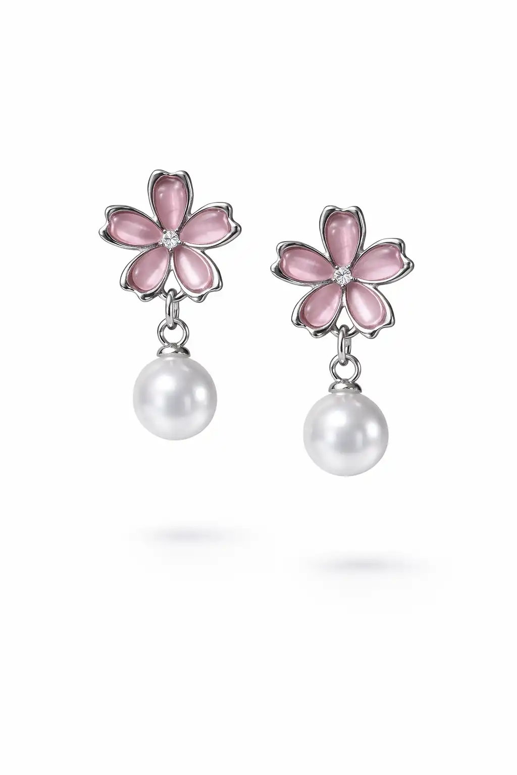 Soft pink floral earrings with a delicate pearl drop, adding a feminine and graceful charm to any outfit.