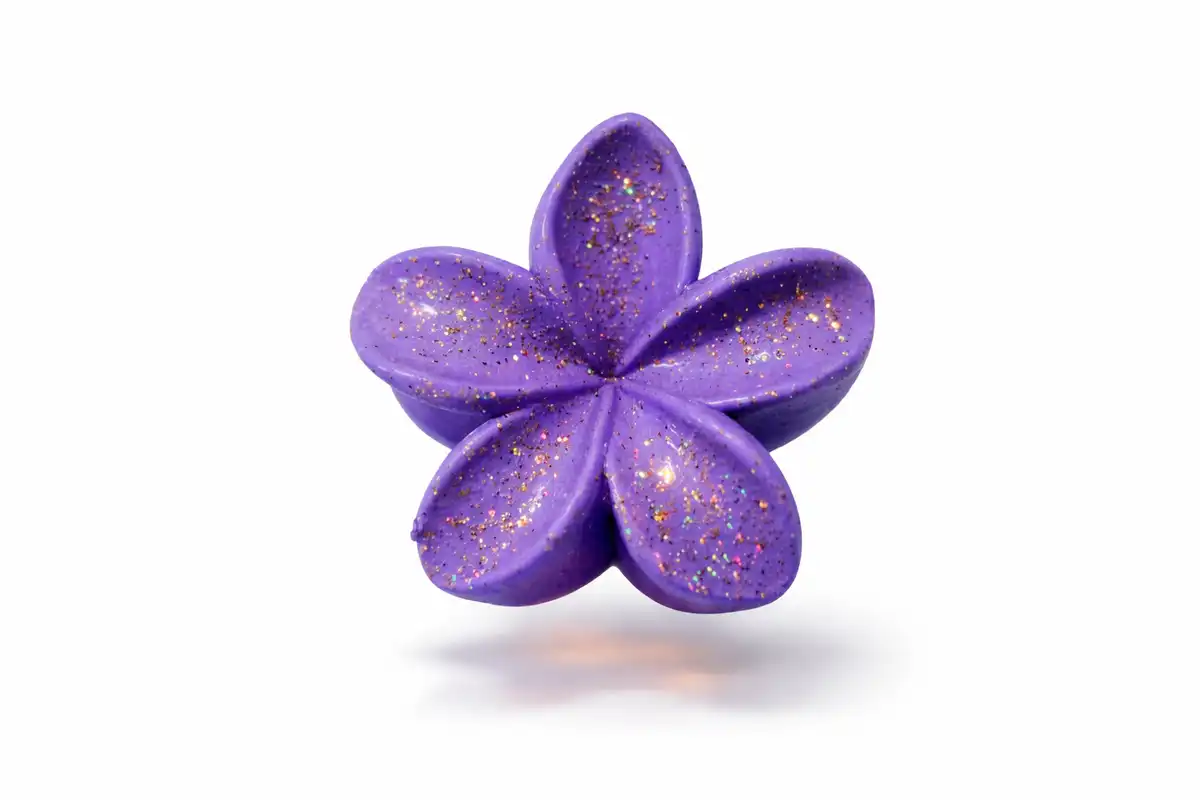 A dreamy purple floral clip sprinkled with glittery sparkles, adding a magical, cute charm to any hairstyle.