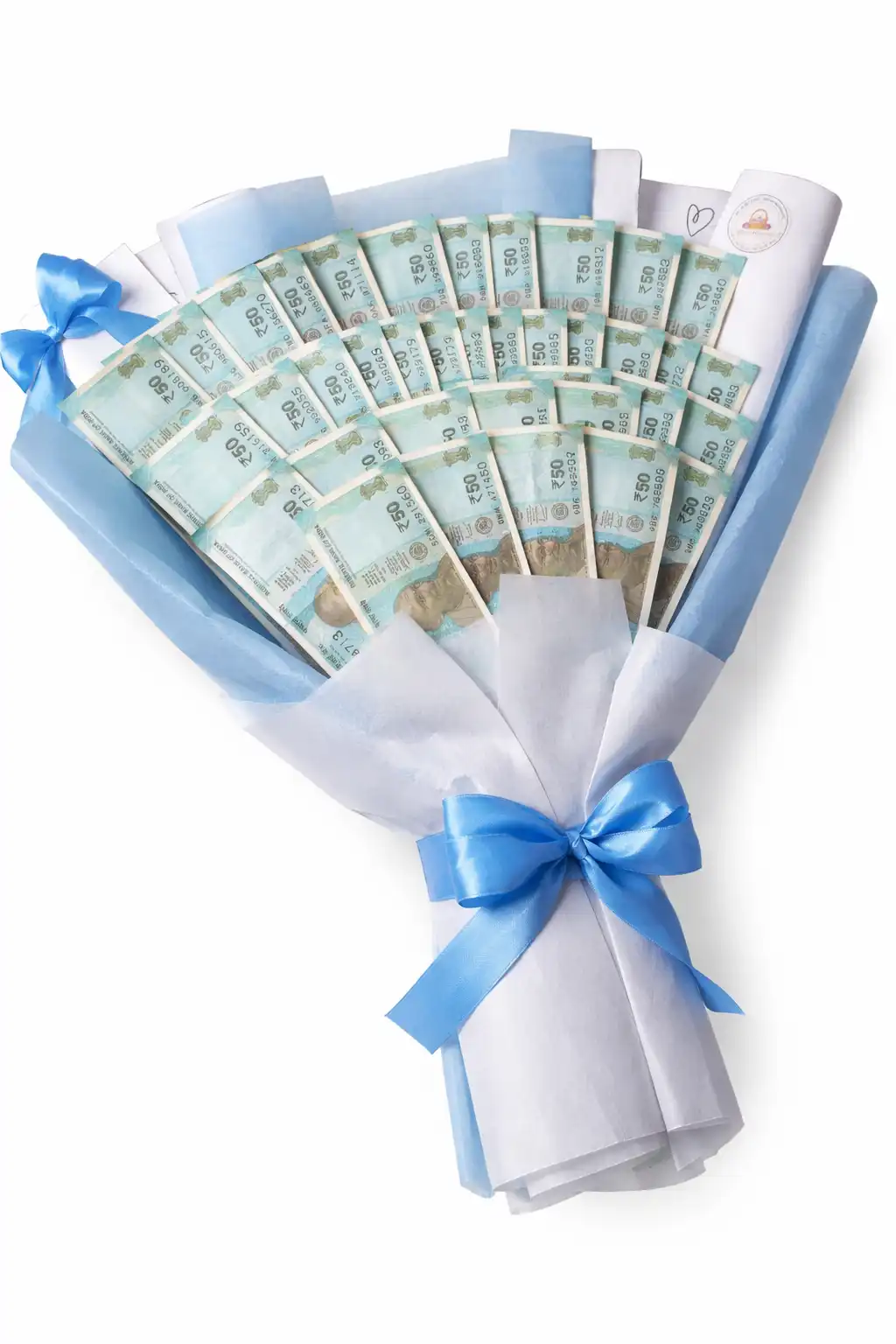 A stylish bouquet crafted with neatly arranged currency notes and wrapped in elegant blue tones—perfect for gifting prosperity with a modern, classy twist.