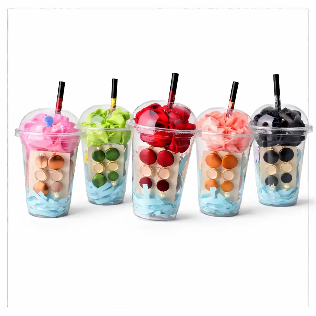 A vibrant 5pcs collection of flower-themed cup gifts filled with 1 Clip Set, 2 mini baby clip ,1 Pair of earring, 1 scrunchie, 1 lip liner, 1 fancy rubber band βperfect for gifting and making any moment special.