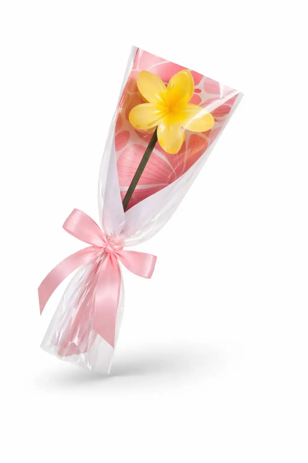 A delicate single yellow bloom wrapped in soft pink floral paper and finished with a satin ribbon, this elegant mini bouquet radiates warmth and charm—perfect for sweet, thoughtful gifting moments.