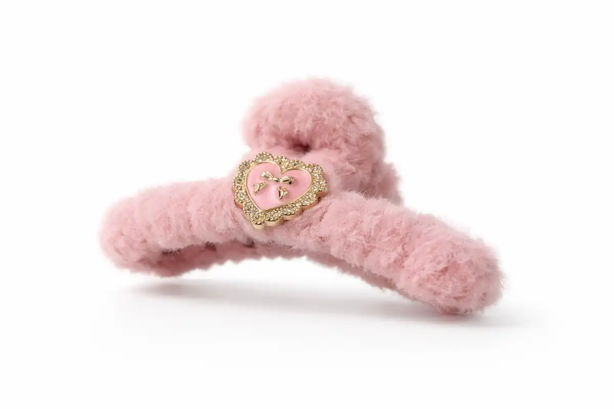 A soft pink fluffy hair claw with a sparkling heart detail, perfect for adding a cute, cozy, and romantic touch to your everyday style.
