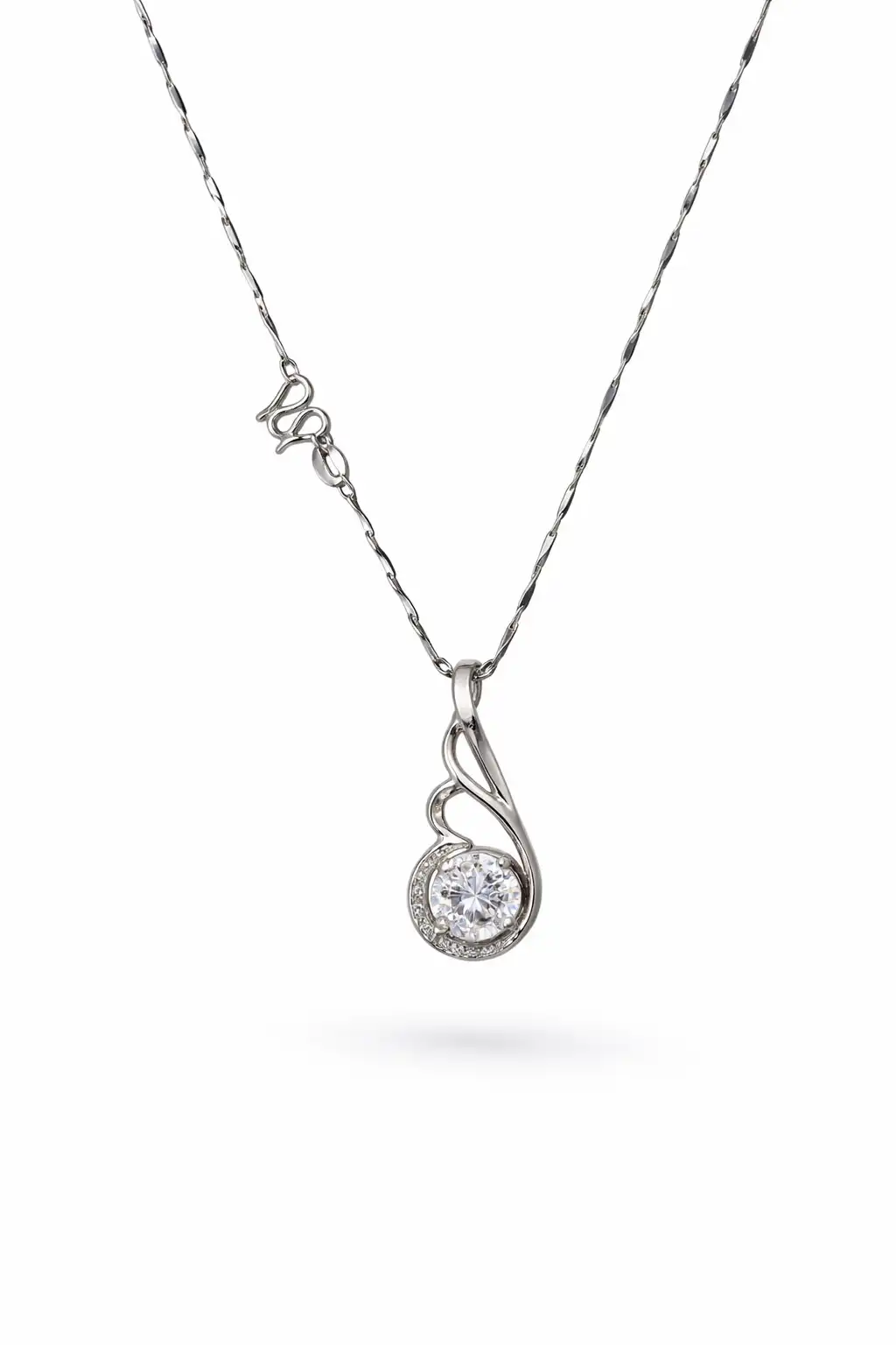 A sleek silver necklace with a graceful swan-inspired curve and a brilliant crystal centerpiece, blending elegance with a modern, delicate shine.