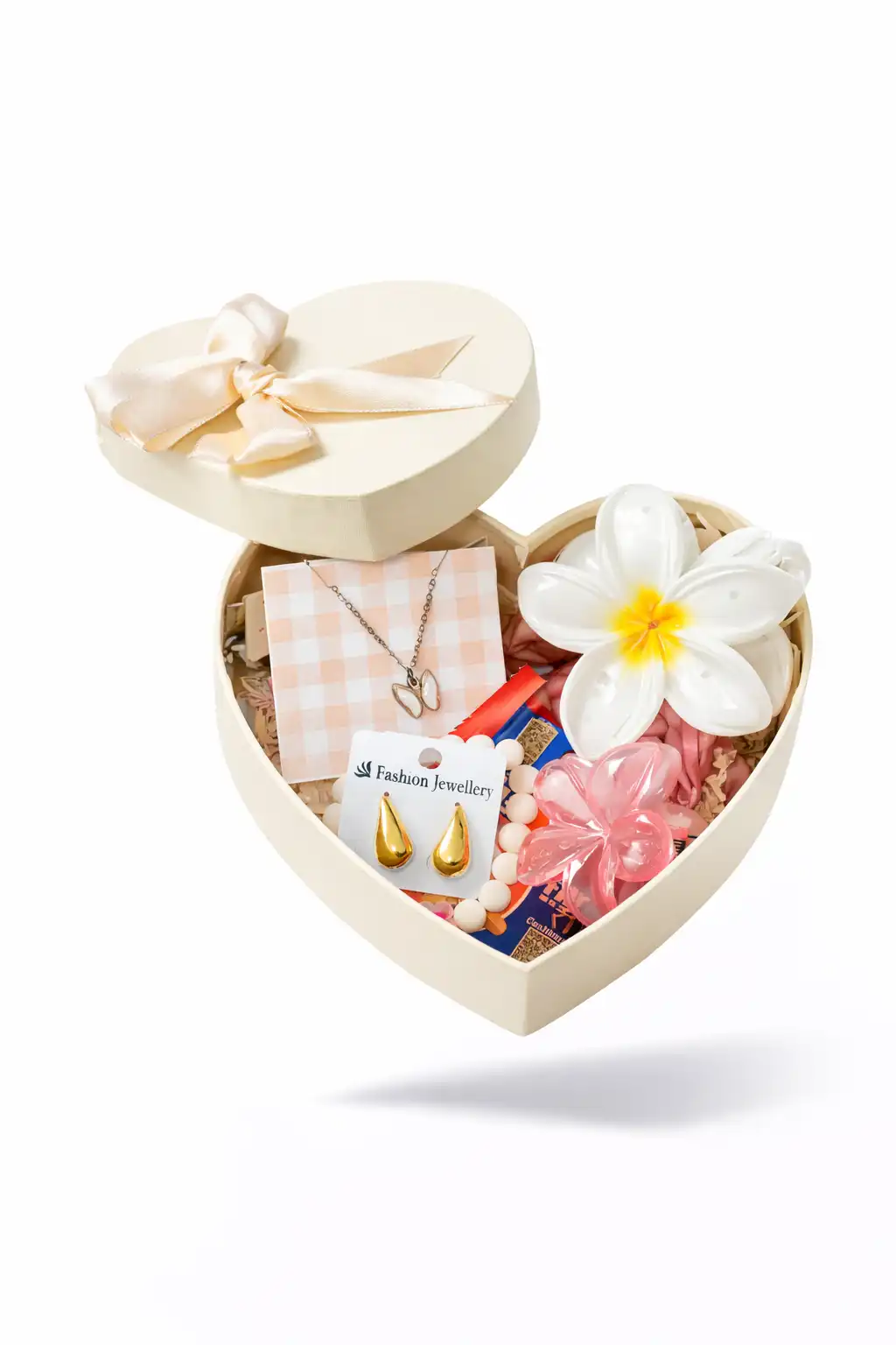 A beautifully curated heart-shaped hamper filled with elegant jewelry and sweet surprises—perfect for expressing love in the most charming way.