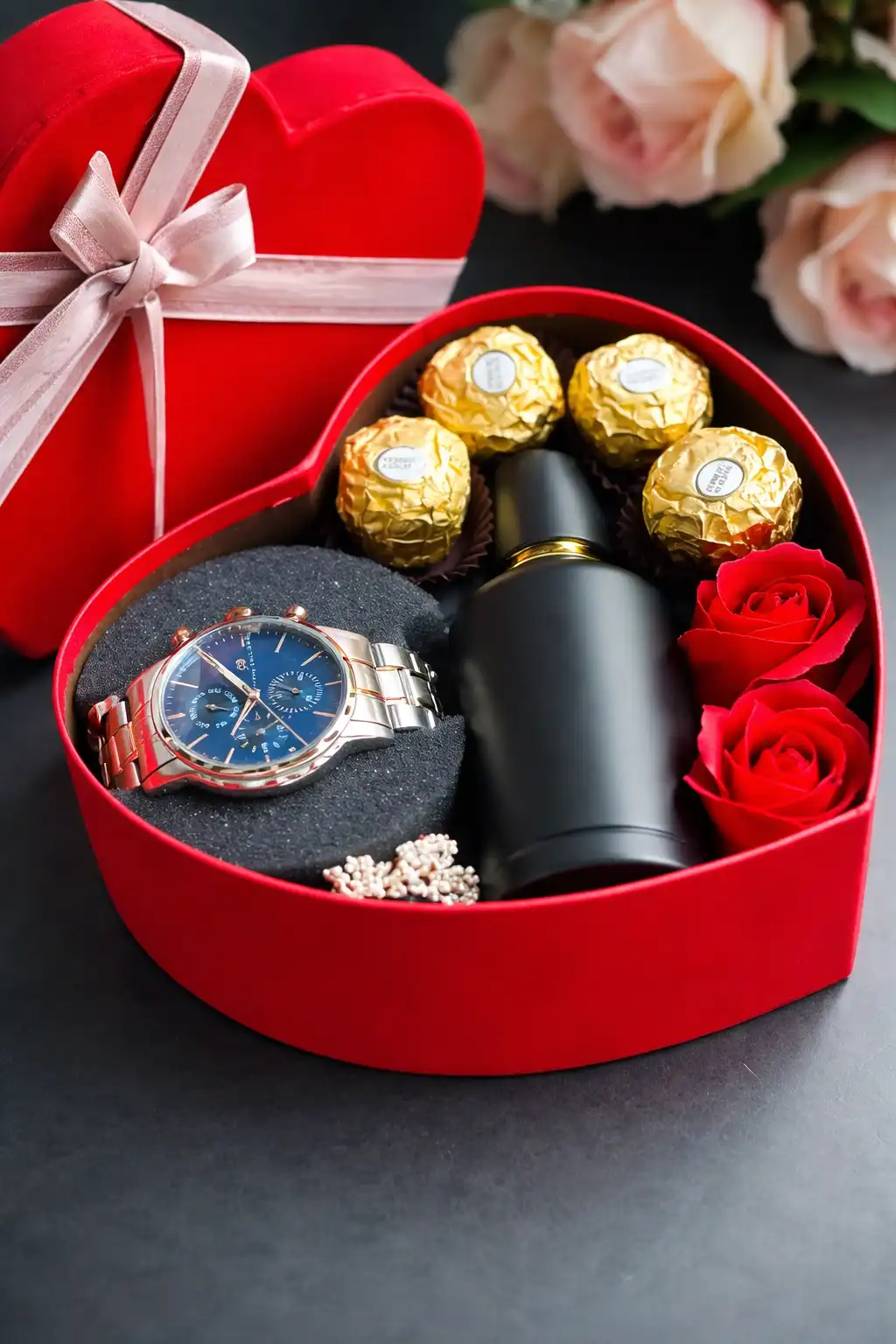 A romantic heart-shaped box with chocolates, watch, perfume, and roses — ultimate love gifting vibe.